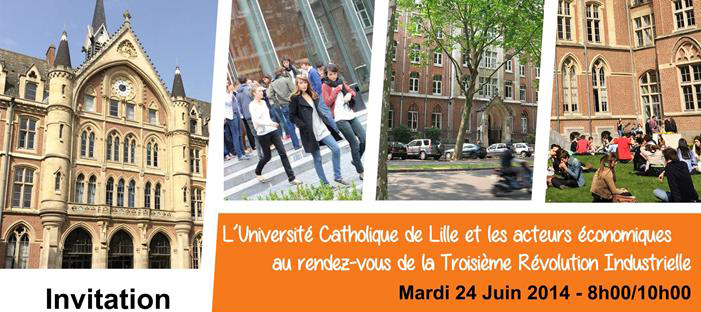 Accueil à partir de 7h45 Philippe Vasseur, Président de la CCI région Nord de France La Troisième Révolution Industrielle dans le Nord-Pas de Calais et les entreprises Pierre Giorgini, Président-Recteur de l’Université Catholique de Lille Jean-François Lécrigny, Vice-Président « Troisième Révolution Industrielle » de l’Université Catholique de Lille Benoît Bourel, Vice-Recteur en charge de la Responsabilité Sociétale d’Université, Directeur de l’IDDR Le Programme LIVE TREE : Lille Vauban en Transition Énergétique, Écologique et Économique – La formation tout au long de la vie, les besoins en compétences des entreprises – Recherche, Développement, Innovation – Les bâtiments démonstrateurs en projet – Les étudiants acteurs – Le quartier Vauban engagé Comment les entreprises peuvent-elles s’impliquer dans ce programme ambitieux ? Merci de confirmer votre participation auprès d’Aude Meunier à l’adresse aude.meunier@univ-catholille.fr ou au 03 20 13 41 97