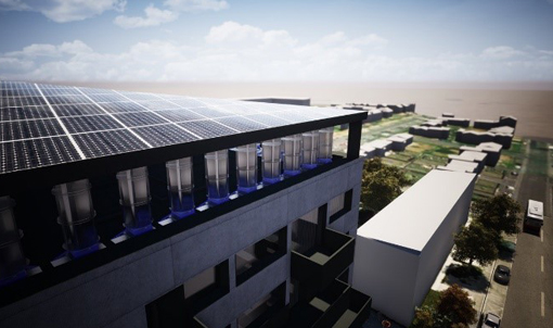 La plateforme d’énergie mixte est un nouvel étage de production mixte solaire/éolien incluant les éoliennes urbaines Unéole recouvertes d’un rooftop photovoltaïque.