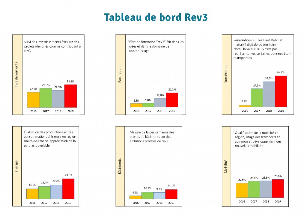 En l’état actuel, 6 indicateurs sont disponibles : Investissements, Formation, Numérique, Énergie, Bâtiments, Mobilité ; autant de domaines concernés d’une manière ou d’une autre par rev3, que ce soit en termes de contribution (investissements, formation…) ou d’impacts (bâtiments, mobilité…).