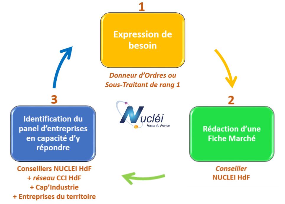 NUCLEI Hauts-de-France élabore, en lien avec les apporteurs d’affaires (donneurs d’ordres ou sous-traitants de rang 1 de la filière nucléaire), des Fiches Marchés présentant leurs besoins en fournitures et prestations.